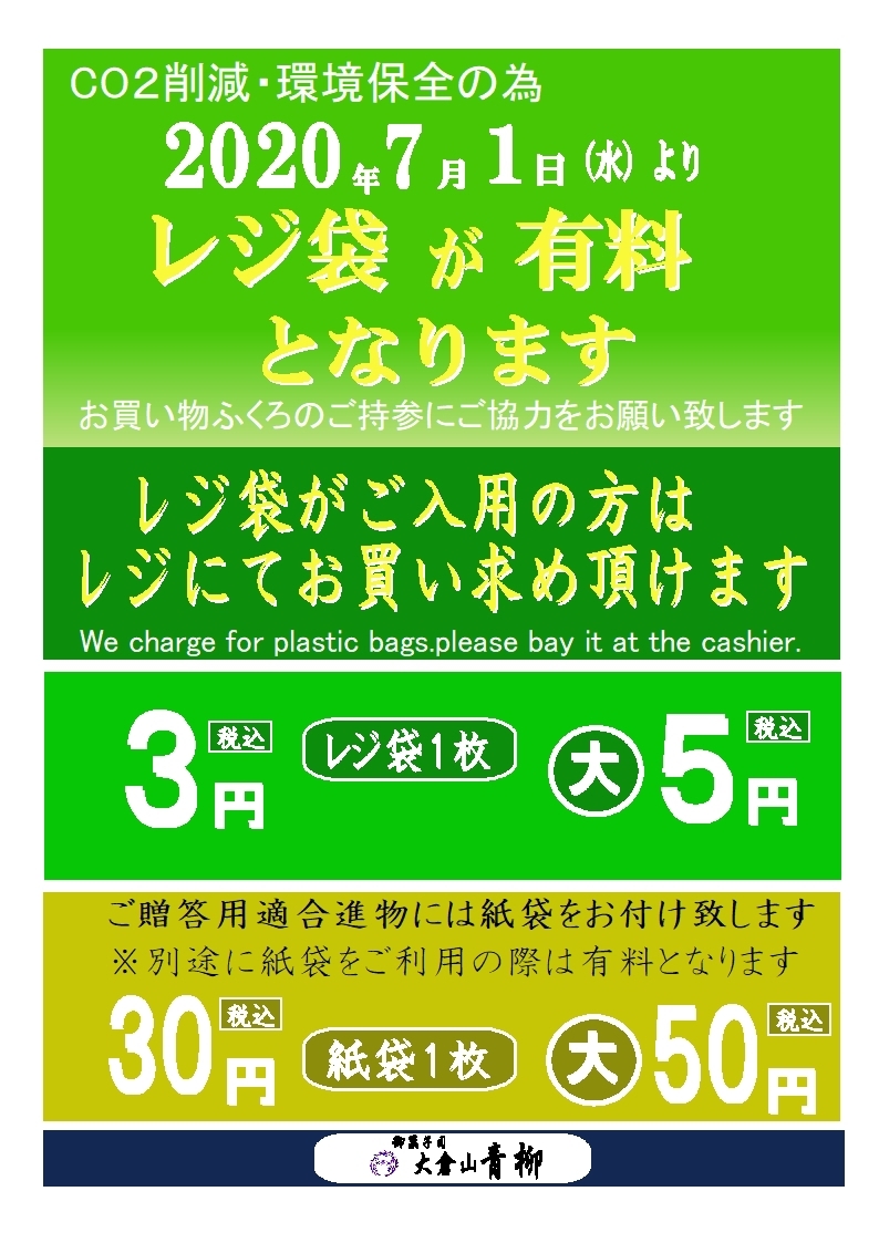 CO2削減・環境保全の為、2020年7月1日より「レジ袋」を有料化させて頂きます。ご理解の程宜しくお願い致します。