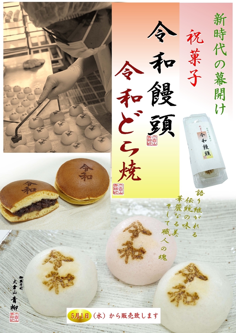 新元号のお祝いに当店自慢の饅頭、どら焼に「令和」の焼き印をしました。日本の伝統と文化を継承致します。