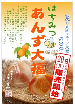 「お待たせ致しました!」あんず果汁ぜりーを「はちみつ餡」で優しく包み、はちみつ漬けあんず求肥餅でモッチリと仕上げました。ほのかな酸味と甘みが絶妙の大福餅で、まだ召し上がっていない方も一度ご賞味いただければ幸いです。夏の暑さ対策に!栄養補給に!冷してお召し上がりくださいませ。 スタッフ一同