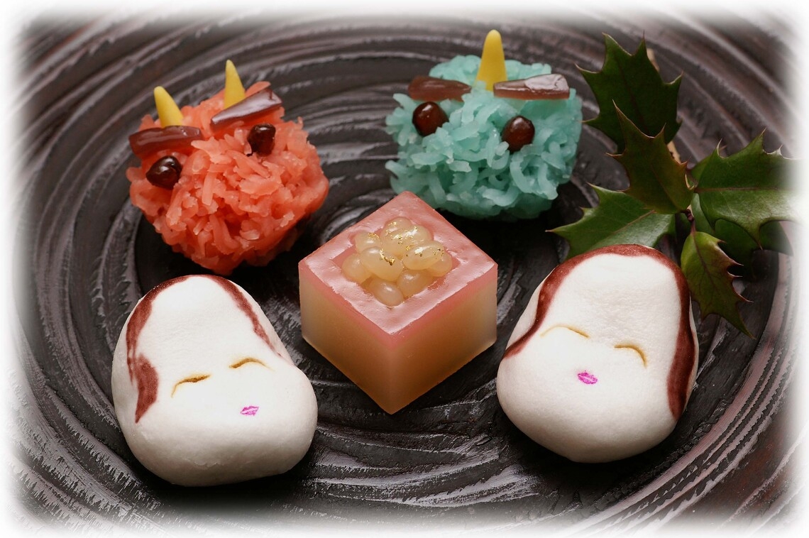 赤鬼・青鬼(御上生きんとん製)・升(羊羹)・お多福饅頭(薯蕷饅頭製)