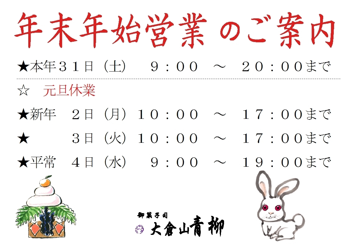 明けましておめでとうございます。昨年中は大変お世話になりました。本年も皆様に喜ばれる和菓子作りに励んで参ります。よろしくお願いいたします。店主敬白
