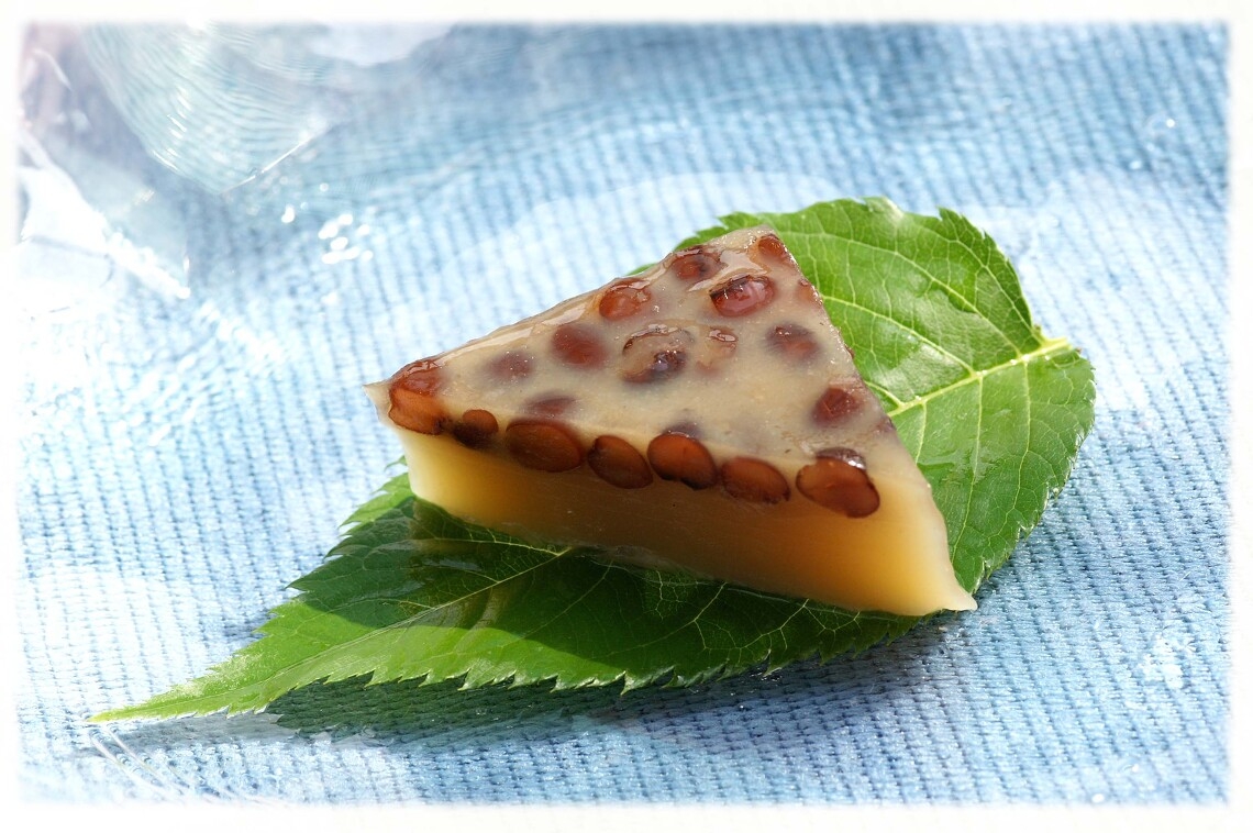六月の晦日は、「水無月の祓」夏越しの祓いとも言われるこの日、厄祓いの願いを込めて このお菓子をお供えします。生地は、わらび粉に和三糖を加え大粒の小豆をのせて蒸しあげました。