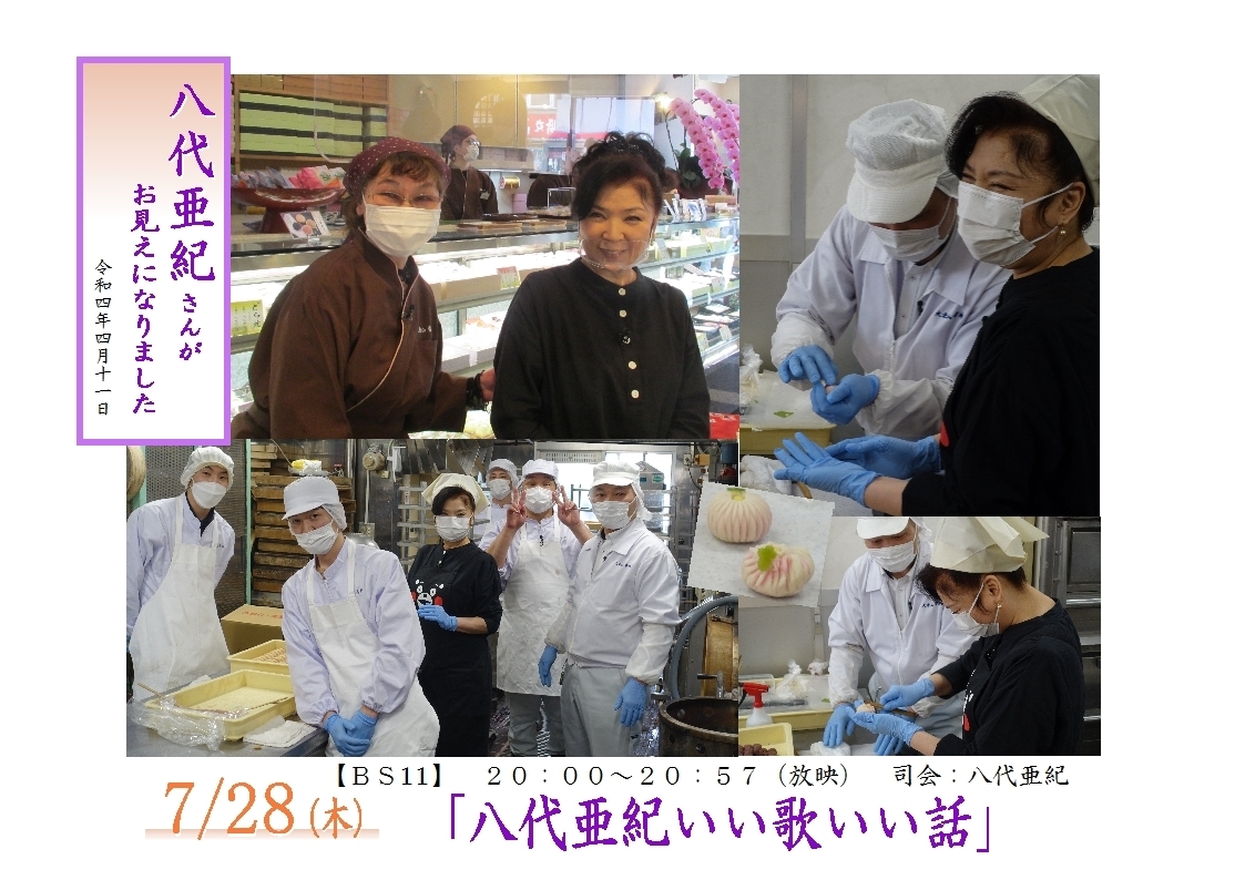 7/28(木)に放映されました。BS11「八代亜紀 いい歌いい話」とても良い思い出ができました。ありがとうございました。スタッフ一同